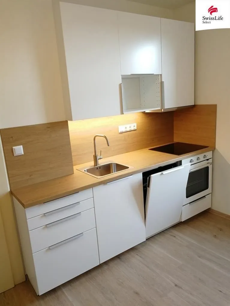 Byt se sestává z neprůchozího pokoje 19 m2, kuchyně vybavené novou kvalitní kuchyňskou linkou se skříňkami s tichými dojezdy a vestavěnými spotřebiči (myčka, trouba, varná deska), včetně lednice a nabízí krásný výhled do zeleně zahrad. K lepší představě o dispozicích Vám poslouží plánek umístěný mezi fotografiemi.