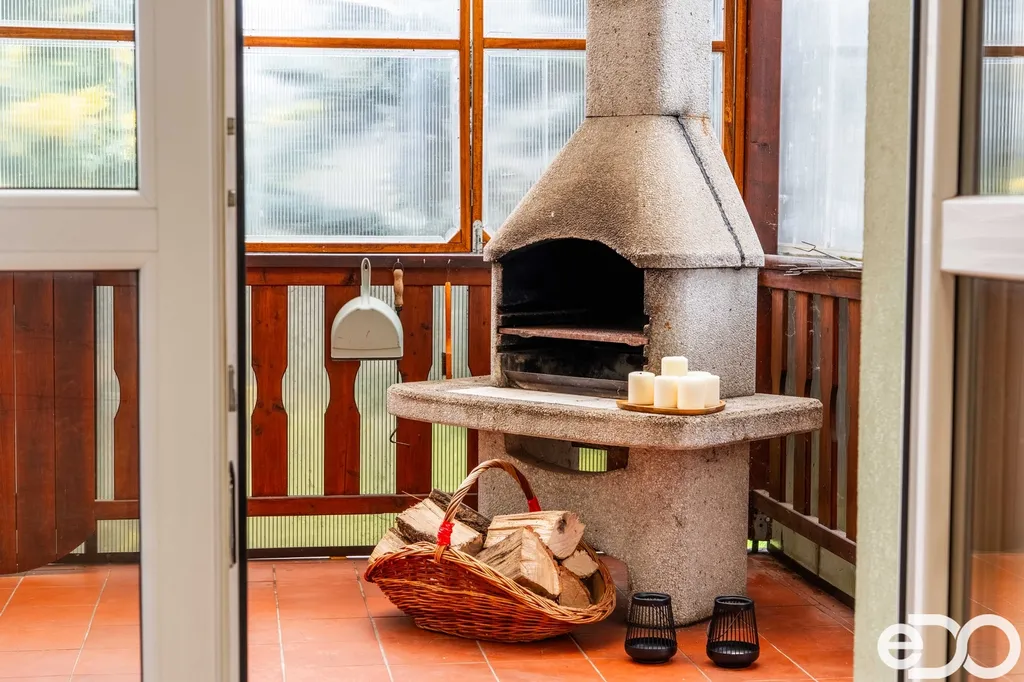Dům je technicky velmi dobře vybavený – kromě kompletních sítí nabízí i vlastní studnu, moderní zabezpečení s online dohledem a klimatizaci pro celoroční komfort. Atmosféru domova doplňují krbová kamna.