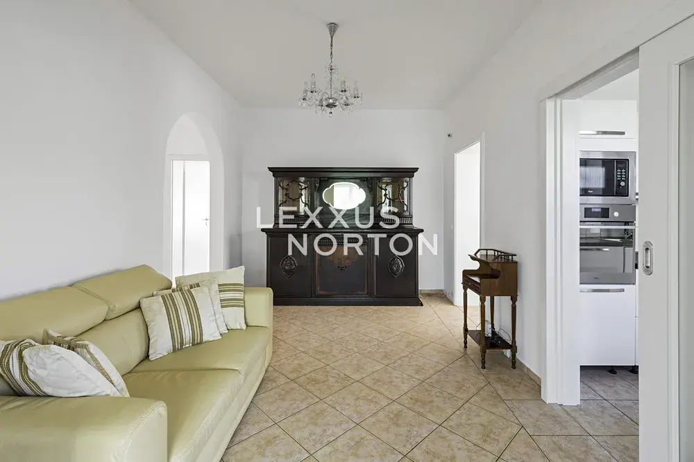 Dům disponuje dvěma koupelnami – první je vybavena vanou, bidetem a toaletou, druhá pak nabízí sprchu a toaletu. Kuchyně je plně zařízená a k dispozici je trouba, mrazák, myčka nádobí i mikrovlnná trouba. V technické místnosti se nachází lednice a pračka. Vstupní předsíň je doplněna prostornou vestavěnou skříní, která poskytuje dostatek úložného prostoru. Obývací pokoj je vybaven krbem, do kterého je možné pohodlně přikládat i z venkovní strany. V domě jsou použity kvalitní podlahové materiály – parkety, dlažba a koberec. Celkový komfort doplňuje centrální vysavač, elektrické žaluzie a podlahové vytápění.