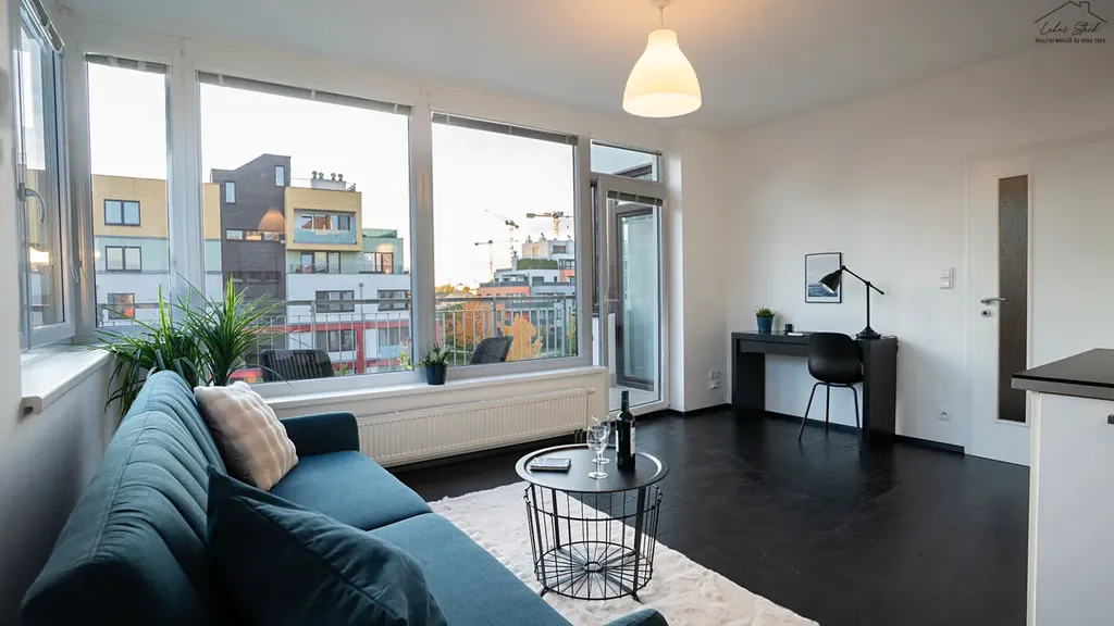 Masivní kuchyňská linka vyrobena míru s praktickým ostrůvkem, vybavená spotřebiči AEG, je navržena tak, aby vám při vaření nic nechybělo. Na velkém stole se pohodlně sejde celá rodina a u pohovky se večer schoulíte s knihou nebo si pustíte televizi. Velká okna pouští dovnitř dostatek světla a když je otevřete, vyjdete na balkon orientovaný na jihozápad. Tenhle směr znamená jediné – dlouhé slunečné odpoledne a večery, kdy tu sedíte s kávou nebo sklenkou vína a koukáte do otevřeného prostoru.