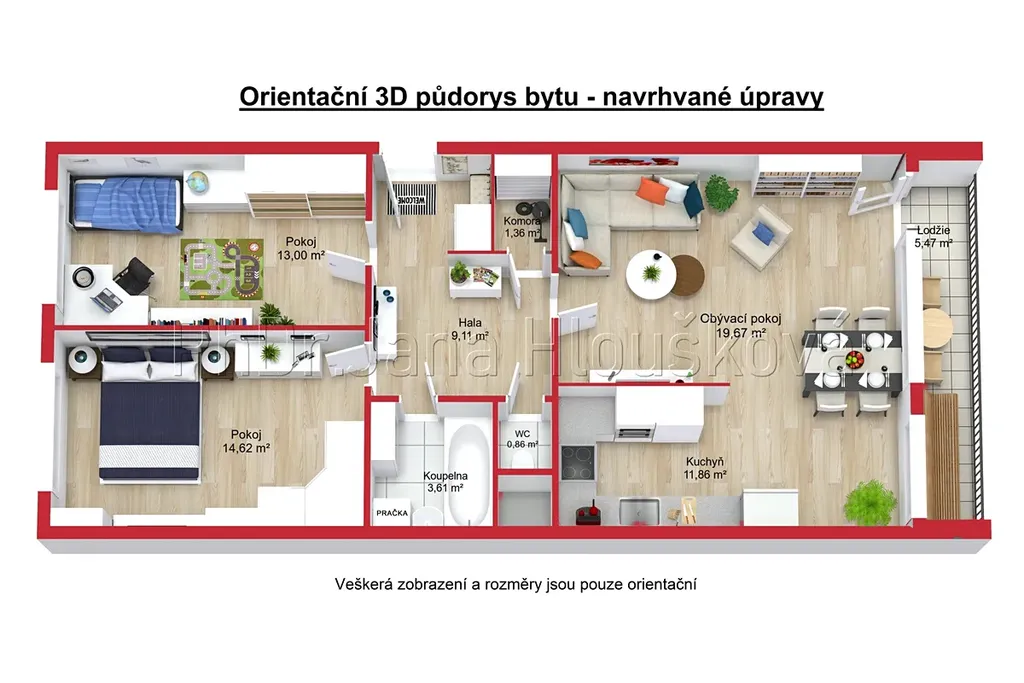 Byt má ideální orientaci na dvě protilehlé světové strany – jihovýchod (OP, kuchyň, lodžie) a severozápad (obě ložnice), což umožní přirozené větrání. Interiér prošel před časem částečnou rekonstrukcí, je zde zděné koupelnové jádro, bezpečnostní vstupní dveře, zasklená lodžie, parkety v OP a dlažba nebo plovoucí podlaha v ostatních místnostech. V jedné z ložnic jsou instalovány i venkovní žaluzie. Centrum bytu tvoří prostorná vstupní chodba, ze které se vchází do všech místností. Vedle prostorného obývacího pokoje se nachází kuchyň, což určitě bude lákat rodiny k propojení obou těchto místností. Jednu z variant, jak by byt mohl vypadat po takové přestavbě, můžete vidět ve vizualizaci i na 3D půdorysu. Ponechat samozřejmě můžete i současnou dispozici bytu, a zachovat tak 3 samostatné neprůchozí pokoje, což uvítají zvláště investoři při následném pronájmu bytu. Současné uspořádání bytu (vč. současného nábytku) a jeho orientační rozměry jsou patrny na 2D půdorysu.