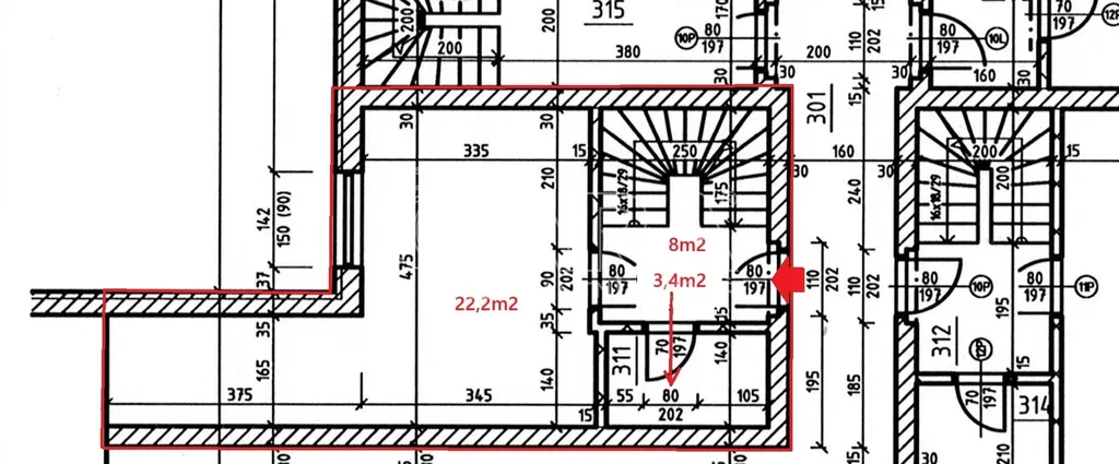 3.NP: obývací pokoj s kuchyňským koutem 22,2 m2, předsíň 8 m2, koupelna se sprchovým koutem 3,4 m2