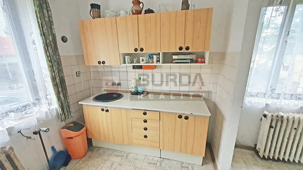 V kuchyni je původní kuchyňská linka bez sporáku a nerezová digestoř.