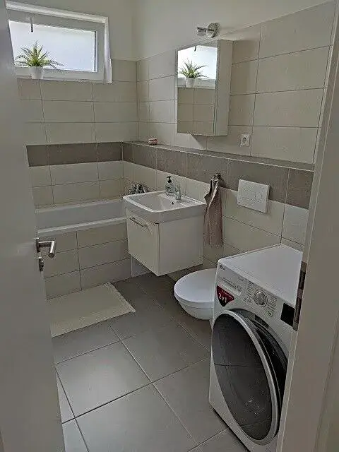 Koupelna: vana, vestavěné umyvadlo, pračka se sušičkou, skříňka, zrcadlo, WC