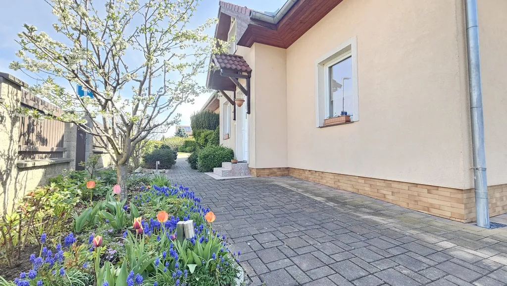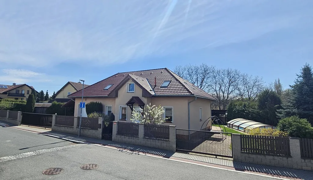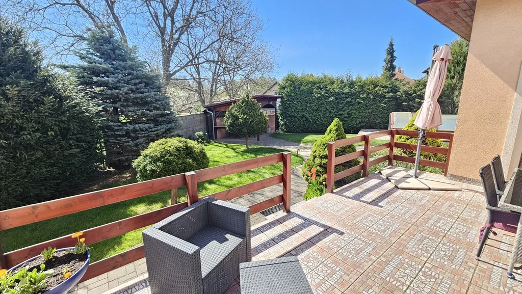 Zahrada je pečlivě udržovaná a orientovaná na jižní stranu, což zajišťuje dostatek světla po celý den. K odpočinku i letním radovánkám slouží krytý bazén, venkovní terasa a pergola nabízející příjemné posezení. Součástí zázemí je garáž pro dva vozy s technickým prostorem, přístřešek pro jedno auto a další parkovací stání přímo na zahradě pozemku.