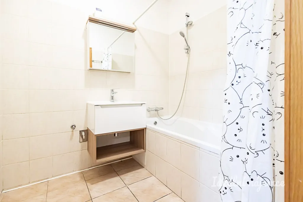 K dispozici je také dva samostatné pokoje. Koupelna je vybavena vanou, umyvadlem a koupelnovou skřínkou. WC má samostatný prostor.