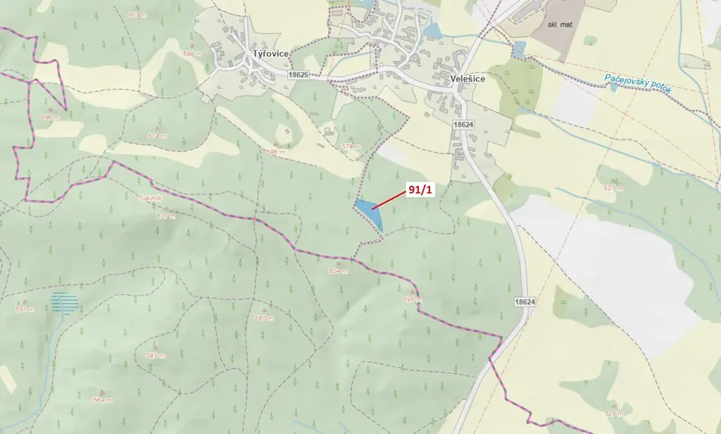 Lesní pozemek o výměře 3251 m2, parcelní číslo 91/1, podíl 1/1, katastrální území Velešice u Pačejova, obec Pačejov, obec s rozšířenou působností Horažďovice, okres Klatovy, Plzeňský kraj. Po těžbě.