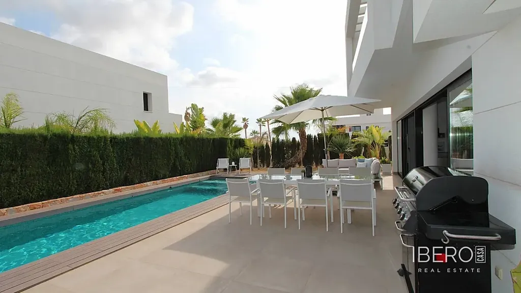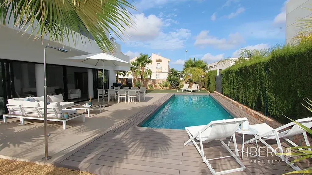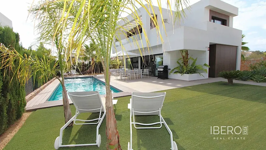 Luxusní bydlení na pobřeží Costa Blanca: moderní vila se 3 ložnicemi, velkým bazénem a tropickou zahradou na prodej.Objevte tuto velkolepou moderní vilu na slunném pobřeží Costa Blanca ve Španělsku, která je k okamžitému nastěhování. Tato moderně navržená nemovitost, která stojí na rozsáhlém pozemku o rozloze 530 m², nabízí vše, co potřebujete k tomu, abyste si mohli naplno užívat středomořského bydlení. Vila je na prodej kompletně zařízená, což vám umožní užívat si svůj nový domov od prvního dne. se třemi prostornými ložnicemi a třemi elegantními koupelnami zaručuje tato vila pohodlí a soukromí pro vás i vaše hosty. Každý pokoj byl pečlivě navržen s použitím vysoce kvalitních materiálů a moderních povrchových úprav, což vytváří harmonické a luxusní obytné prostředí (jedna z ložnic se nachází v přízemí a má vlastní koupelnu). skutečným vrcholem této nemovitosti je její úžasný soukromý bazén, ideální pro relaxaci a osvěžující koupání v teplých letních dnech. Okolní zahrada nabízí dostatek prostoru k relaxaci, opalování a užívání si pobytu na čerstvém vzduchu. Jsou zde také ideální prostory pro venkovní zábavu, takže zde můžete trávit dlouhé letní večery s rodinou a přáteli.Vila se nachází v klidné a bezpečné oblasti, se snadným přístupem ke krásným plážím, obchodům, restauracím a veškerému vybavení, které nabízí pobřeží Costa Blanca.Pro golfové nadšence: Nenechte si ujít tuto jedinečnou příležitost pořídit si luxusní vilu v jedné z nejžádanějších oblastí Španělska. Kontaktujte nás ještě dnes pro více informací nebo pro sjednání prohlídky.