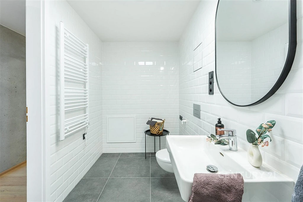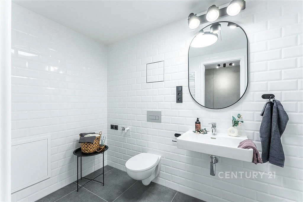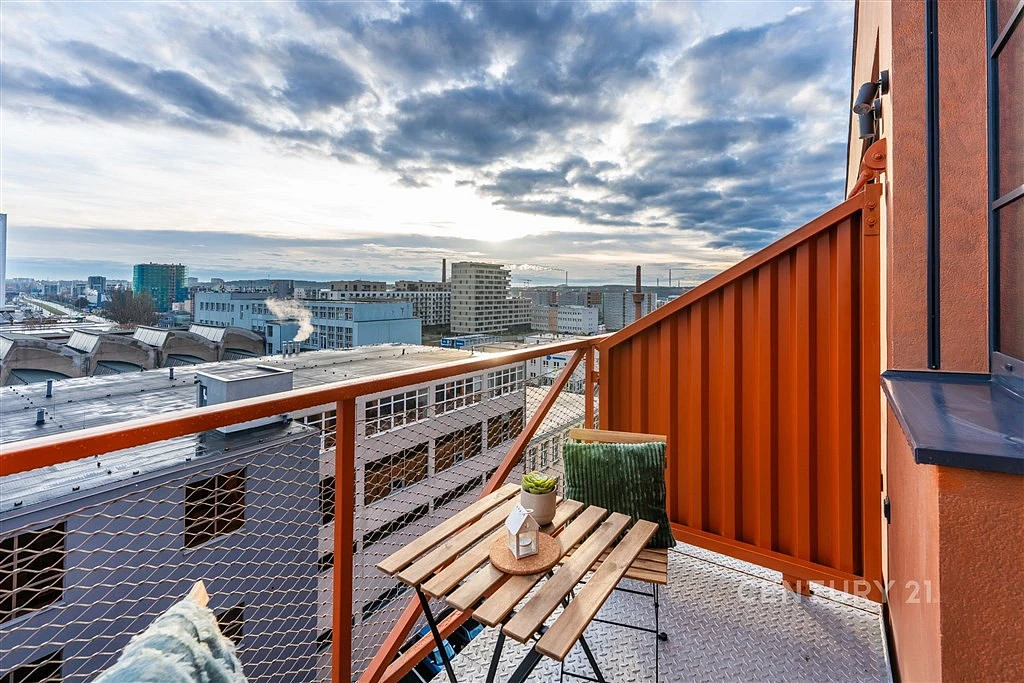 Byteček v ultraindustriálním stylu, navazující na historii původního objektu továrny, je vybavený kuchyňskou linkou s vestavěnými spotřebiči: vysokou lednicí s mrazákem, myčkou, troubou, indukční varnou deskou a digestoří. Do prostorné koupelny se sprchovým koutem se vejde pračka i sušička, vybavena je základními doplňky.