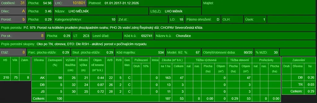 - p.č. 979 vedená jako lesní pozemek o celkové výměře 2 884 m2 (stáří lesa 83 let - zastoupení dřevin akát, dub, jasan)