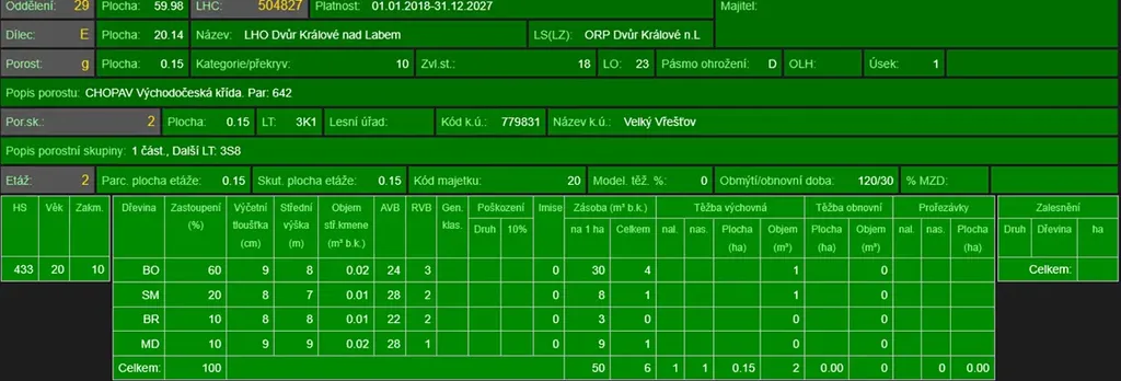 - p.č. 1358 vedená jako lesní pozemek o celkové výměře 1 545 m2 (stáří lesa 27 let - zastoupení dřevin borovice, smrk, bříza, modřín)