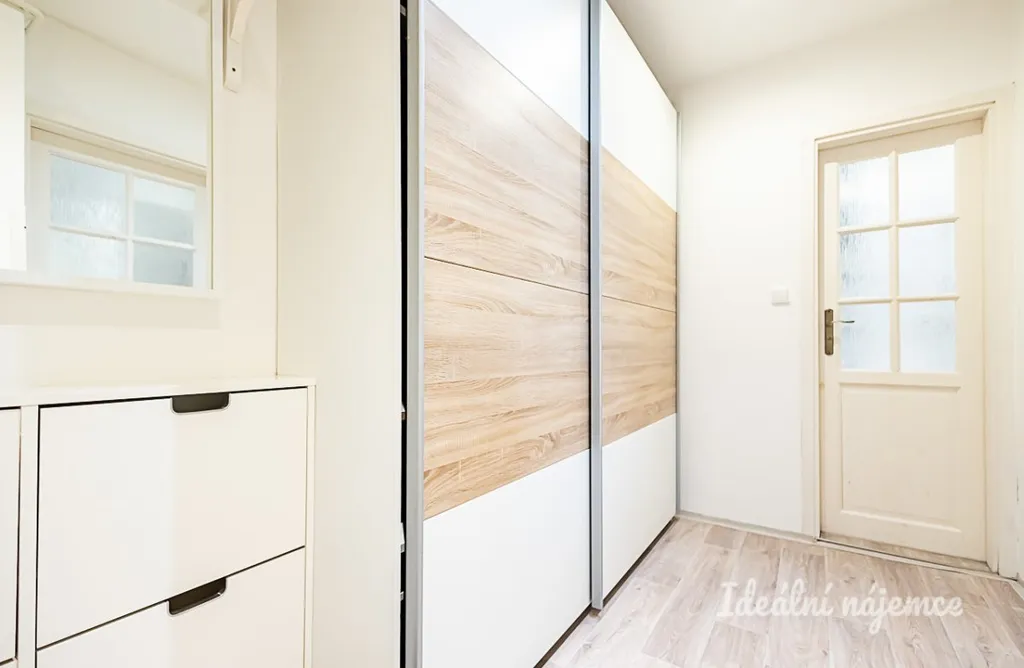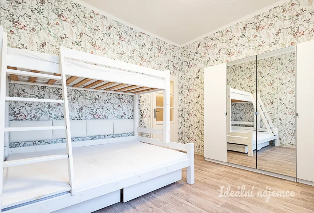Byt je částečně vybavený, což nabízí ideální možnost dotvořit si interiér podle vlastních představ. Kuchyňská linka je plně vybavena – k dispozici je lednice s mrazákem, elektrická a mikrovlnná trouba, indukční varná deska, digestoř i jídelní kout. Obývací část je zařízena pohodlným gaučem a je zde prostor pro konferenční stolek či další doplňky. Samostatný pokoj je ideální jako ložnice a je vybaven poschoďovou postelí a úložnou skříní. Koupelna nabízí sprchový kout, umyvadlo s koupelnovou skříňkou, pračku a toaletu.