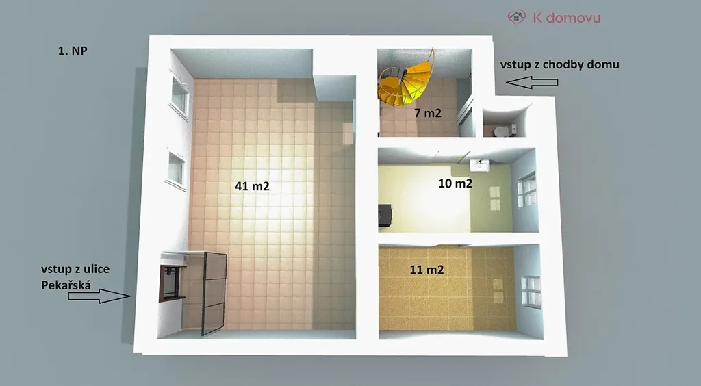 • Přístup: Točité schodiště z prodejny nebo samostatný vstup z domovní chodby (lze oddělit provoz).
