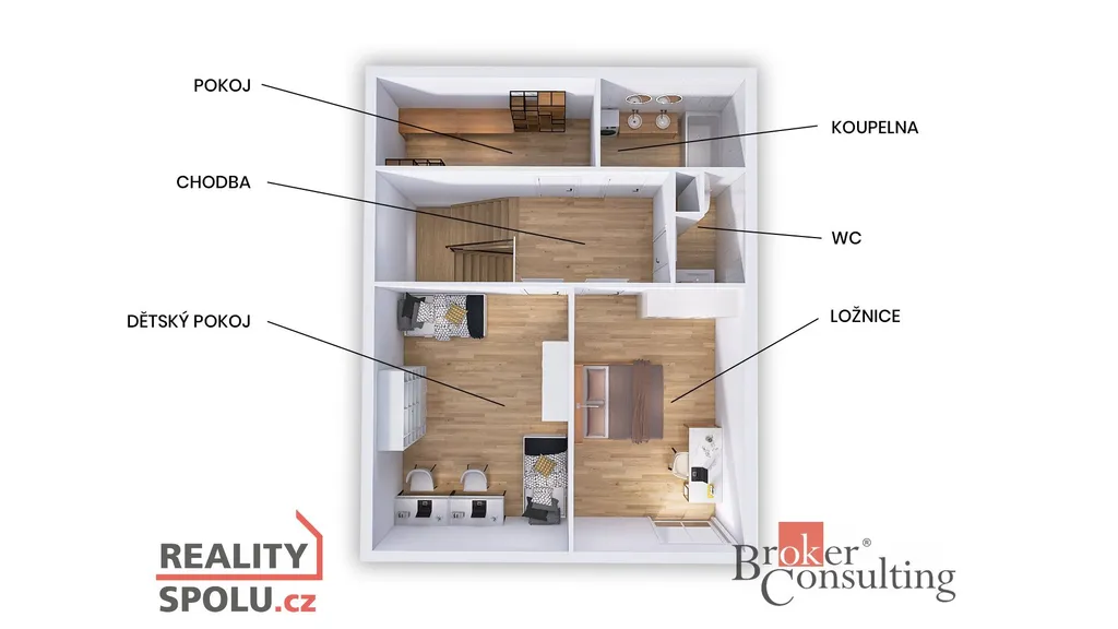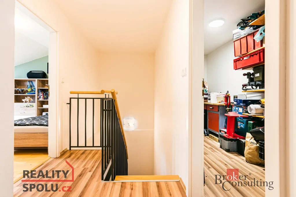 Hlavní výhodou mezonetu je dokonalé oddělení soukromí. V patře najdete dětský pokoj a ložnici, koupelnu se samostatným WC a velkorysou komoru o rozloze 8 m², která poskytuje více úložného prostoru, než nabízí většina bytů v této kategorii.