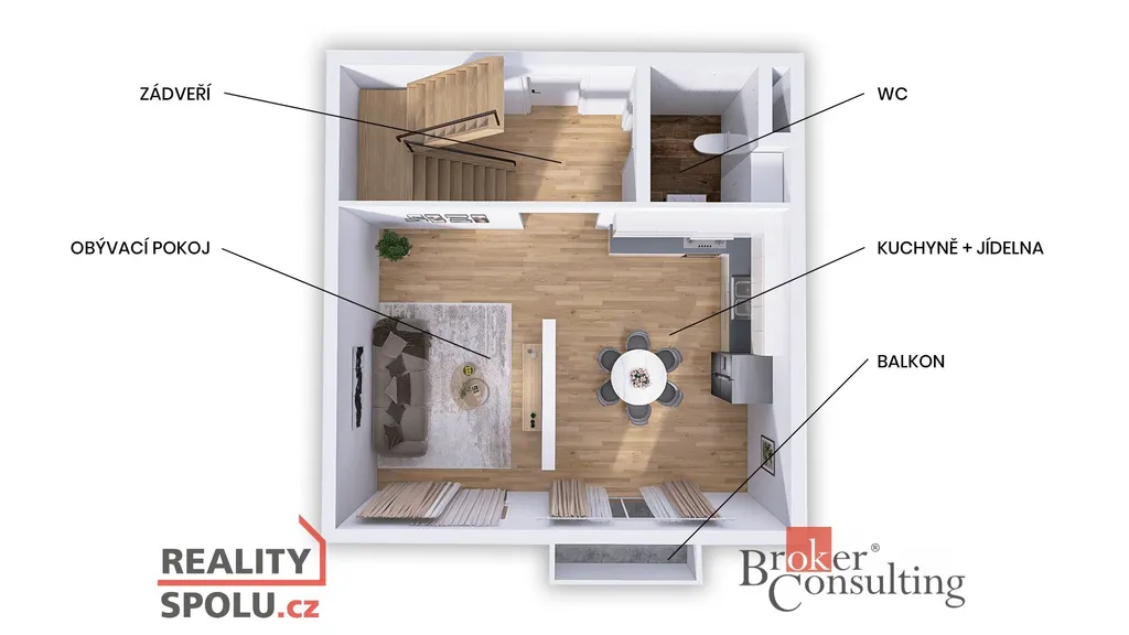Hned po vstupu vás přivítá otevřený obytný prostor o velikosti 28,7 m², který spojuje světlý obývací pokoj, jídelní kout a moderní kuchyni. Byt působí díky mezonetu vzdušně, prostorně a má krásné denní světlo. Z obývací části je vstup na balkon. Ve spodním poschodí se nachází samostatné WC.