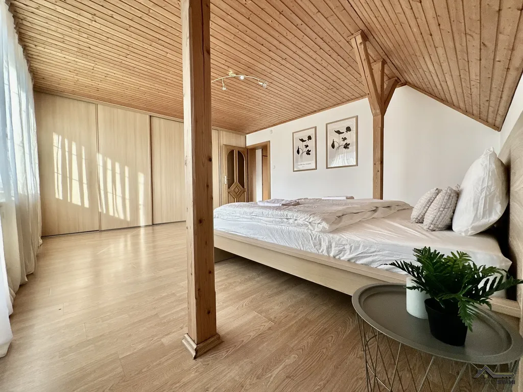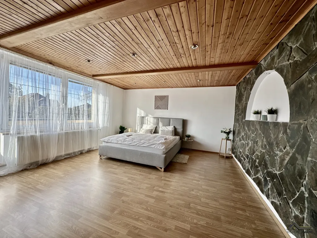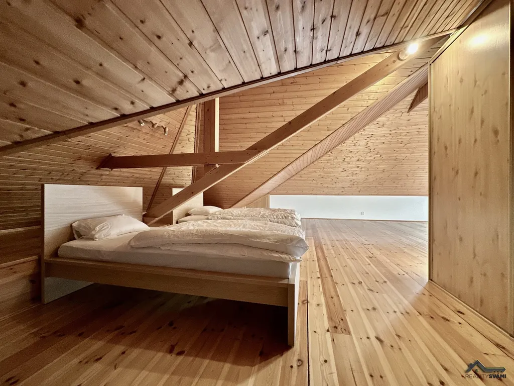 Do 2NP se dostaneme přes krásné dřevěné schody, které jsou dominantou domu. Na těchto schodech se opravdu nešetřilo a jsou vyrobené z masivu. V patře najdeme opět koupelnu, samostatnou toaletu, a protože v patře níže je pánský pokoj, zde je naopak vytvořena šatna pro dámy, následuje ložnice, obývací pokoj, který je propojen s jídelním koutem a masivní kuchyni, která patří mezi další dominantu domu.