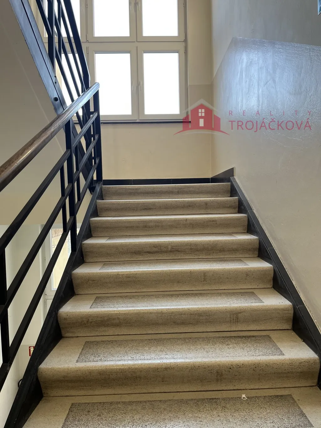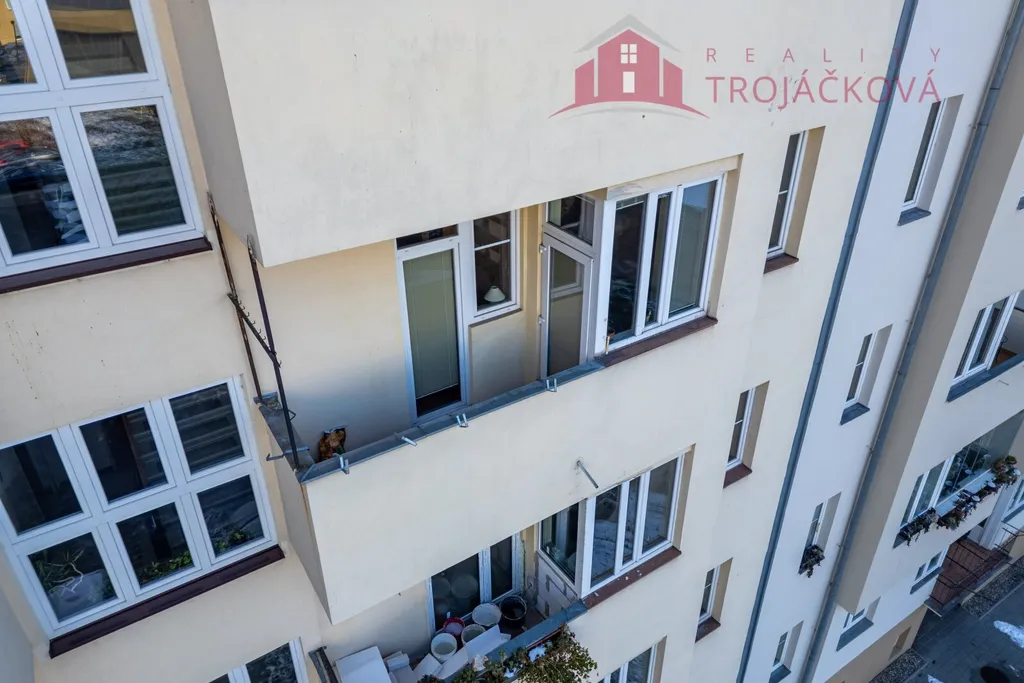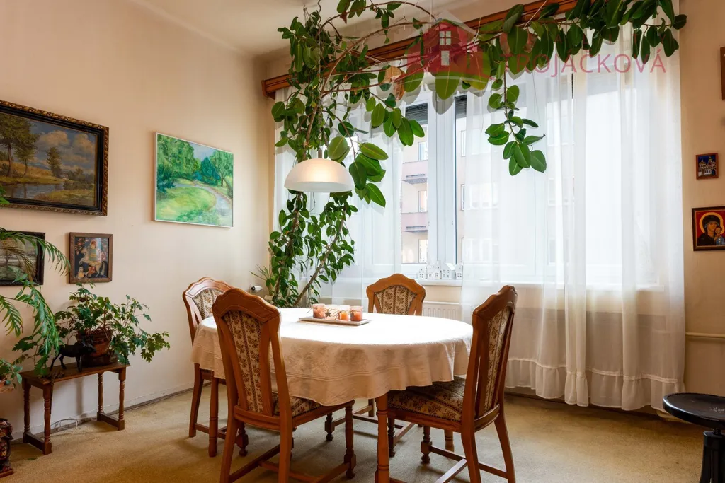 Dispozice bytu je velmi praktická. Po vstupu do bytu vejdeme do prostorné předsíně/haly/ s originálním kazetovým stropem. Z předsíně je samostatný vstup do obývacího pokoje a dětského pokoje s balkonem. Ložnice je dostupná, jak z obývacího pokoje, tak z předsíně. Na předsíň navazuje malá předsíňka, ze které je vstup do koupelny s vanou, do samostatného WC a do kuchyně. Z dětského pokoje a kuchyně se vchází na balkon, který je průchozí a je orientovaný do vnitrobloku. Součástí kuchyně je starší kuch.linka, plyn.sporák a lednice. Z kuchyně je také vstup do komory a spíže. Byt je vytápěný vlastním plynovým kotlem. Stejně je řešen i ohřev vody. Podlahová krytina jsou parkety a na nich koberce. V kuchyni a v koupelně dlažba. V bytě byla provedena výměna oken za plastová a okna do ulice mají elektrické rolety. Před 10 lety proběhla rekonstrukce koupelny včetně rozvodů vody. V domě je rozvod TV a internetu. K bytu náleží velký sklep a komora na patře.