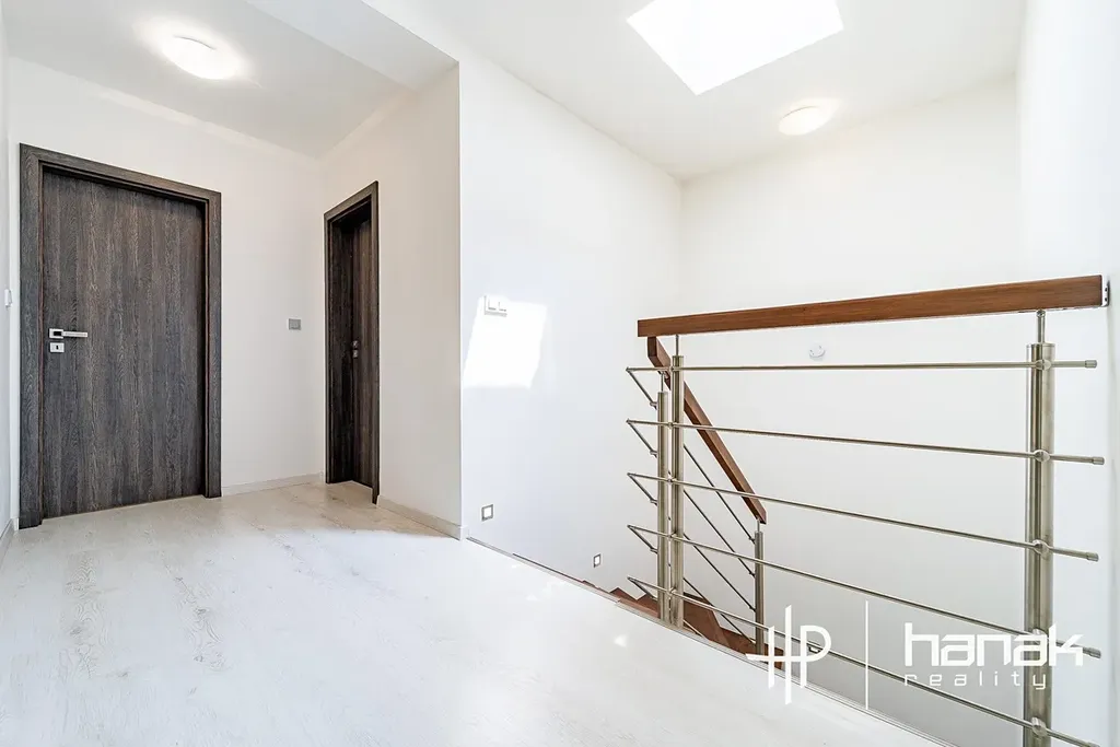 Po schodišti s LED osvětlením se dostaneme do druhého nadzemního podlaží. Zde se nachází koupelna s vanou, toaletou, dvojitým umyvadlem a sprchou. Ložnice zde tvoří 3 velké pokoje o výměře 17,5 m2, 22 m2 a 16 m2 s velkou šatnou 7 m2, který je orientovaný do ulice.