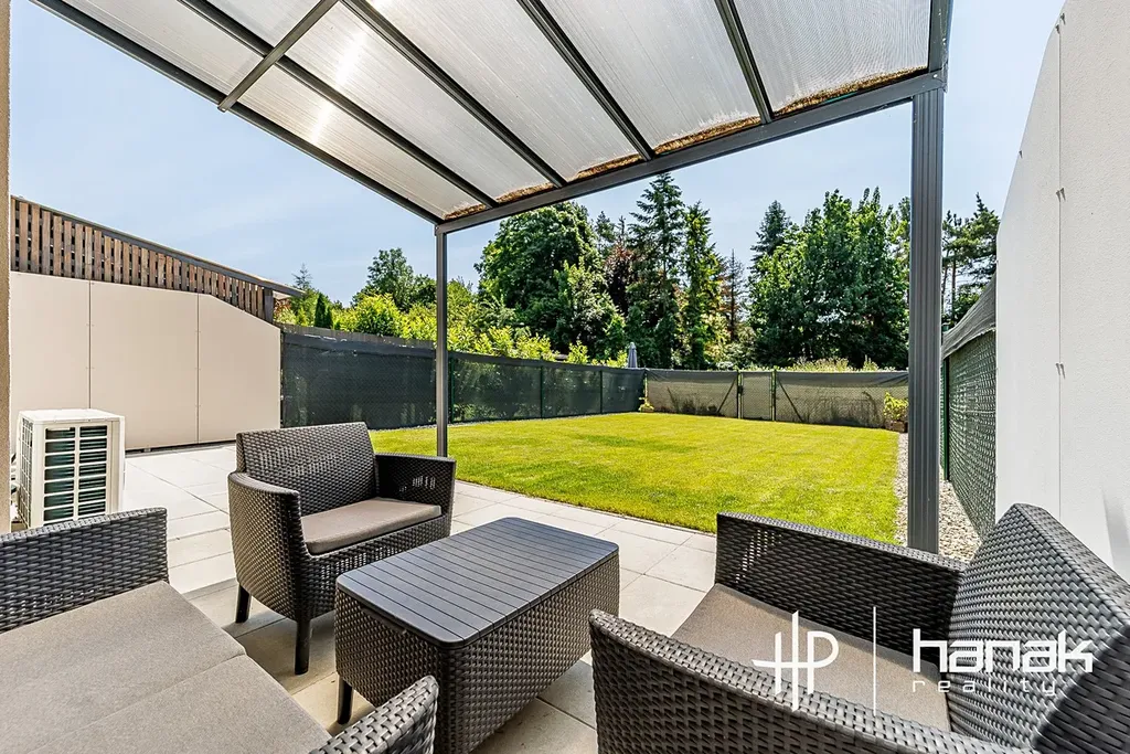 Dispozice domu nabízí prostorné zádveří s úložnými prostory a vstupem do pracovny (13,5 m2), koupelny se sprchovým koutem, umyvadlem, toaletou a technickou místností s pračkou, sušičkou a technologií domu. Přízemí dále nabízí schodišťový prostor s praktickým světlíkem pro přísun denního světla a vstup do hlavního obytného prostoru. Ten má výměru 42 m2 a nabízí dostatek místa pro velkou kuchyňskou linku, jídelní stůl, televizní stěnu a prostornou sedací soupravu. Výhodou je zde prosvětlený interiér díky jižní orientaci a také možnost využití komínové vložky pro krb v zimních měsících. Z prostoru jídelny se vstupuje na částečně krytou terasu s krásným výhledem do zahrady a stromořadí za ní. Zahrada je rovinatá a velmi jednoduchá na údržbu.