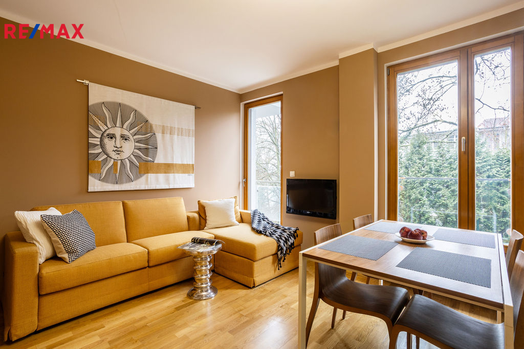 Byt s podlahovou plochou 51,2 m² je situován v 1. nadzemním podlaží osmipodlažního domu z roku 2010, postaveného ve vysokém standardu. Interiér bytu zdobí velká francouzská okna, která poskytují krásný výhled do zahrady domu a zároveň prostor zaplavují denním světlem. Dům je umístěn ve svahu.