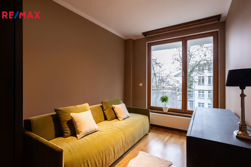 Byt se prodává kompletně vybavený. Interiér nabízí mimo jiné designový a kvalitní nábytek pocházející z Itálie a Španělska. Jedinečný charakter doplňují lustry a stylové zrcadlo dovezené z Nizozemska. Byt je vybaven vším, co je potřeba pro okamžité nastěhování a komfortní život bez dalších investic. V obýváku, ložnici a předsíni jsou položeny dřevěné plovoucí podlahy ve výborném stavu. Byt je vytápěn z vlastní kotelny domu a je vybaven regulovatelnými otopnými radiátory. Výjimečnou předností bytu je skvělá lokalita a originální vkusné vybavení.