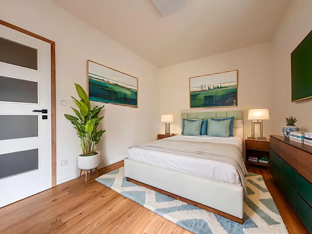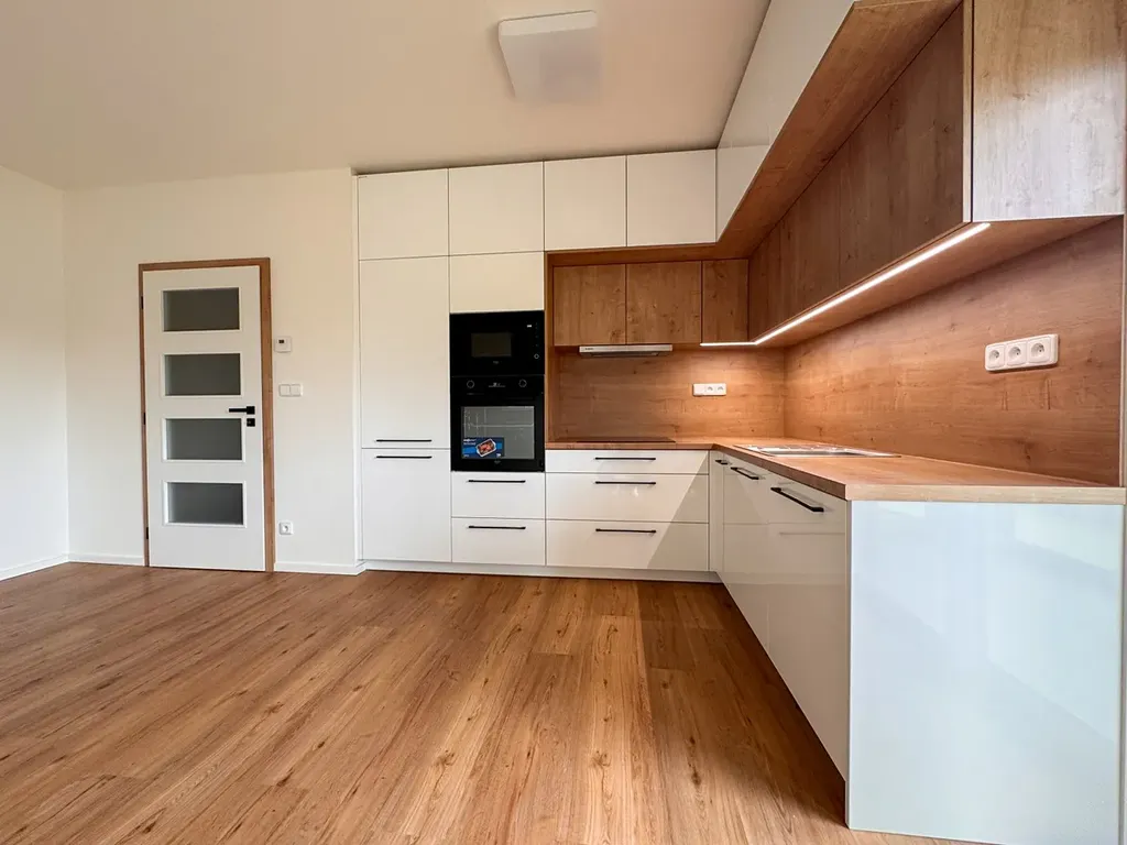 Dominantou bytu je obývací pokoj s kuchyňským koutem a přímým vstupem na prostorný balkon. Kuchyňská linka je vyrobena na míru truhlářem a je plně vybavena vestavnými spotřebiči – myčkou, kombinovanou lednicí s mrazákem, elektrickou troubou, mikrovlnnou troubou a varnou deskou. Ložnice nabízí dostatek prostoru pro manželskou postel i šatní skříně. Koupelna je vybavena velkým sprchovým koutem, kvalitními obklady a designovým umyvadlovým setem. Byt je laděn do světlých, neutrálních barev a působí velmi čistým, moderním dojmem.