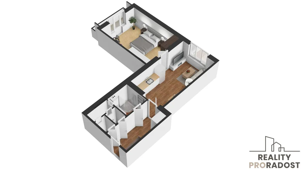Byt má praktické uspořádání. Po vstupu vás přivítá prostorná chodba, ze které se vchází do pokoje s obývacím koutem a novou kuchyňskou linkou, novým sporákem a lednicí. Z tohoto pokoje vstupujeme do velké ložnice. Koupelna je vybavená sprchovým koutem, umyvadlem a je zde i místo na pračku. Toaleta je zvlášť. V bytě je i malá komora. Topení a ohřev vody zajišťuje plynový kotel umístěný v koupelně. Celý byt působí klidným a vzdušným dojmem, je čerstvě vymalován a připraven k nastěhování.