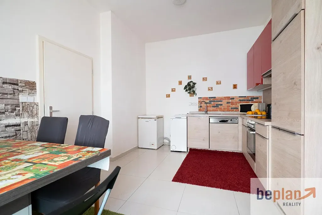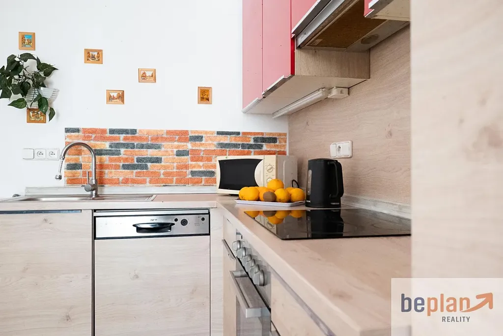 Kuchyňská linka v kombinaci přírodního dřevodekoru a výrazného červeného lesklého povrchu přináší do prostoru nádech modernosti a osobitosti. Je to ta nenucená kombinace funkcionality a stylu, která umožňuje budoucím majitelům připravovat ranní kávu nebo večeři po dni stráveném v lázních s pocitem, že stojí na místě, které má duši. Plastová okna zajišťují příjemnou tepelnou izolaci a tiché prostředí, a dálkové vytápění dodává komfort a bezstarostnost, které se od kvalitního bydlení na této úrovni očekávají.