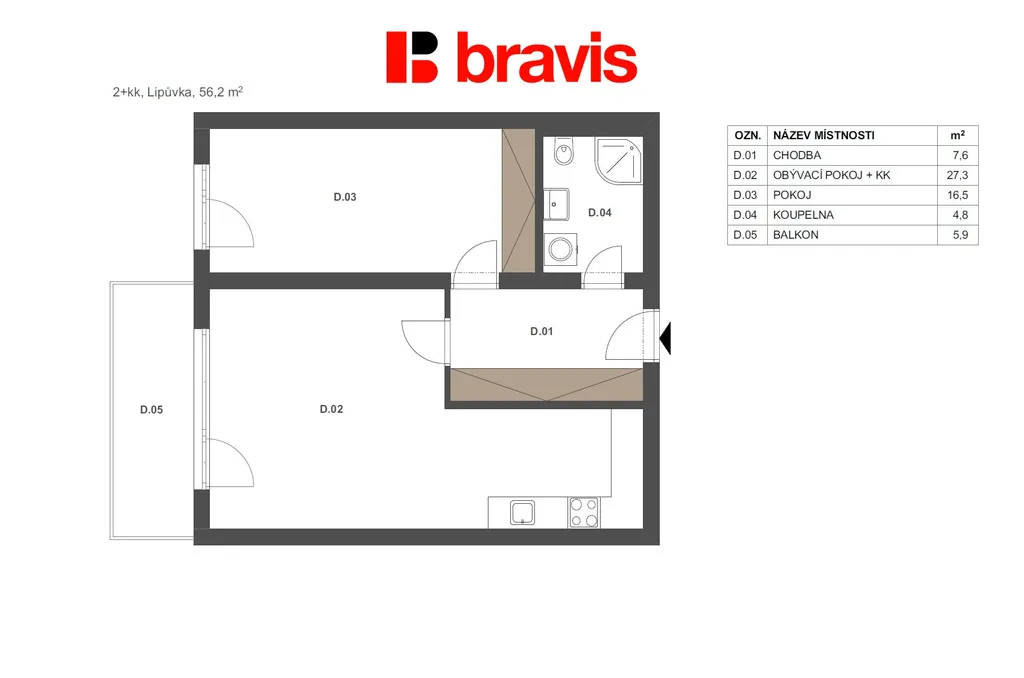 Ve výhradním zastoupení developera nabízíme k prodeji novostavbu bytu o dispozici 2+kk (2D) a užitné ploše 56,2 m² v obci Lipůvka u Brna. Tento byt je ideální volbou pro jednotlivce, mladé páry nebo jako investice do budoucna. Byt nabízí velkorysý obývací pokoj s kuchyňským koutem o velikosti 27,3 m2 a pokoj o vel. 16,5 m2. Součástí je také prostorná chodba (7,6m2), kde je dostatek místa pro vestavěný nábytek.