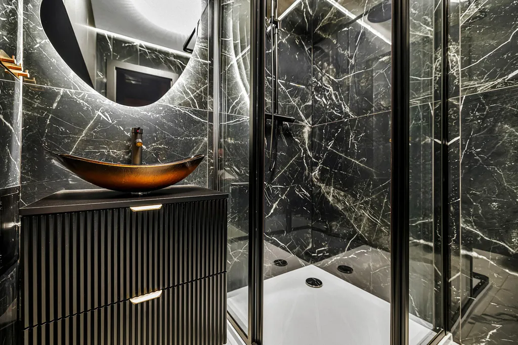 • Luxusní koupelna – velkoformátová dlažba, prémiová sanita, podsvícení, které vytváří wellness efekt.