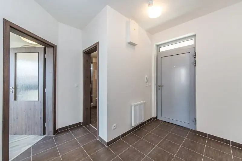 Byt je zařízený kuchyňskou linkou se sklokeramickou varnou deskou, horkovzdušnou troubou a lednicí, koupelna se sprchovým koutem a WC, v předsíni vestavěná šatní skříň.