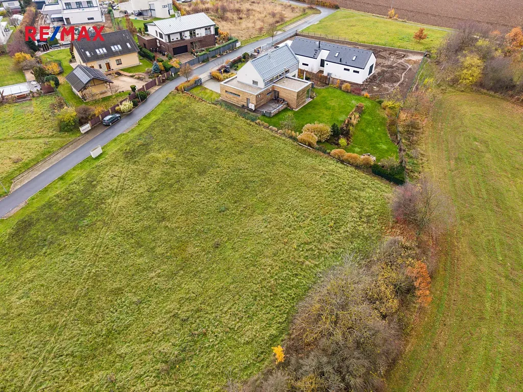 Pozemek má optimální výměru 1 760 m² a jeho tvar poskytuje značnou flexibilitu při umístění rodinného domu i zahradních úprav. Přístup je veden z místní asfaltové komunikace v obytné zóně. Na hranici pozemku jsou přivedeny všechny inženýrské sítě, včetně elektřiny, plynu, vodovodu i kanalizace, což výrazně usnadňuje a urychluje přípravu stavby. Součástí fotodokumentace jsou jak architektonické vizualizace, tak aktuální letecké záběry, které ukazují skutečný stav pozemku a jeho zasazení do okolní krajiny.