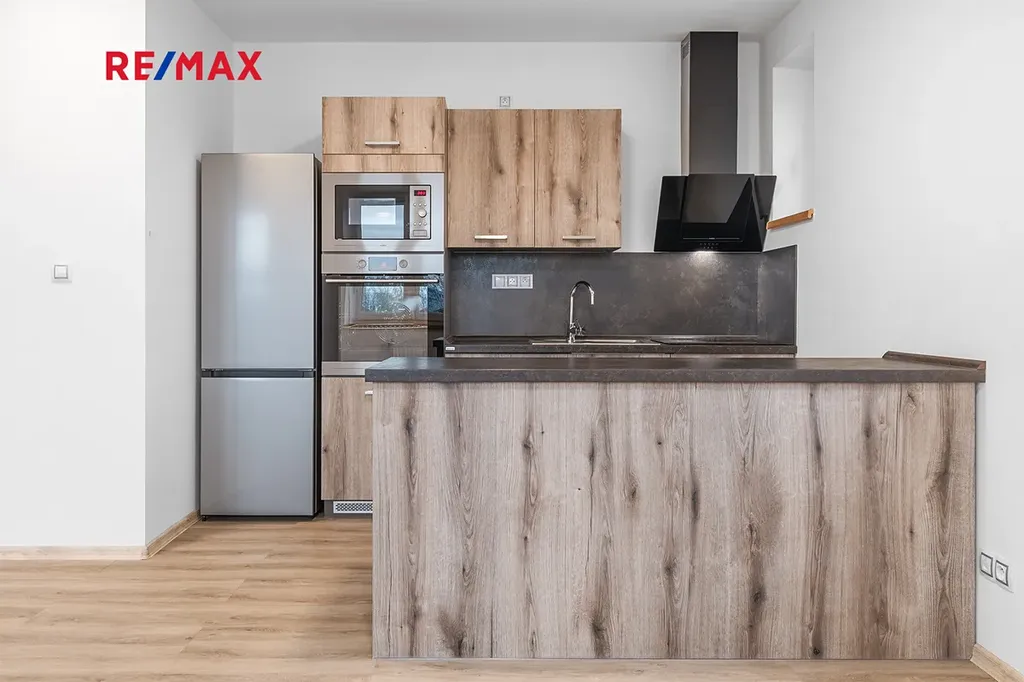 Byt je nabízen nezařízení, součástí pronájmu je kompletně vybavená kuchyňská linka s vestavnými spotřebiči - indukční varnou deskou, elektrickou troubou, digestoří a lednicí s mrazákem.