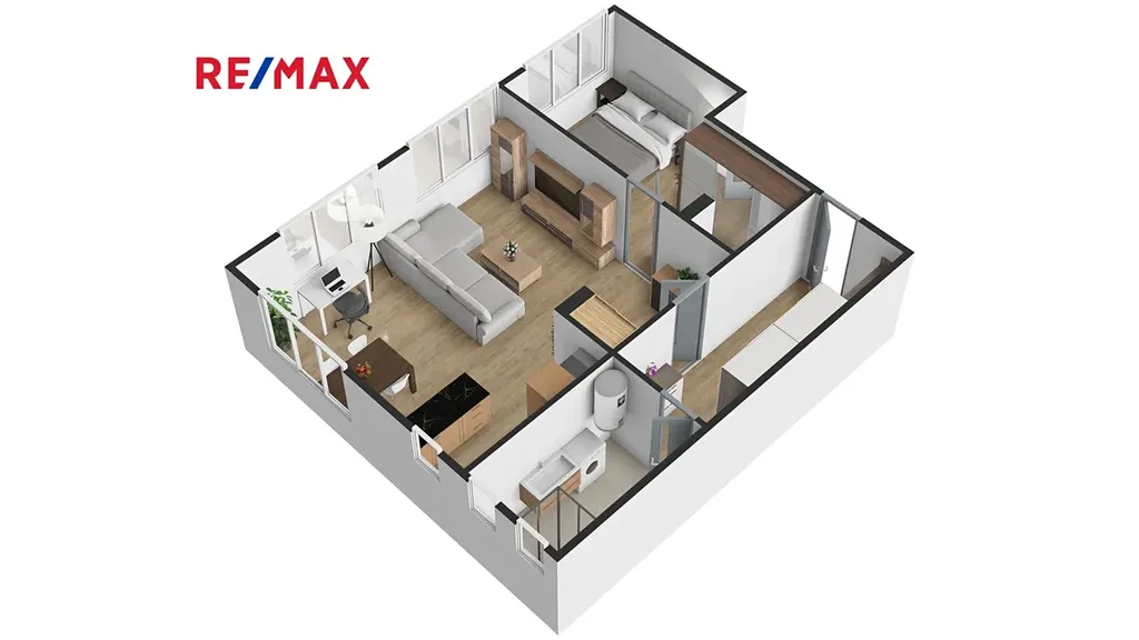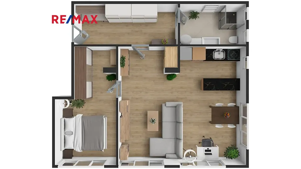 Dispozice bytu nabízí prostornou předsíň, ložnici a multifunkční obývací pokoj, který je zdařile členěn na jednotlivé zóny. Na plně vybavenou kuchyňskou linku plynule navazuje jídelní část, dále zóna pro relaxaci a prostor se najde i pro pracovní koutek. Nechybí samozřejmě koupena se sprchovým koutem, toaletou a místem pro pračku.