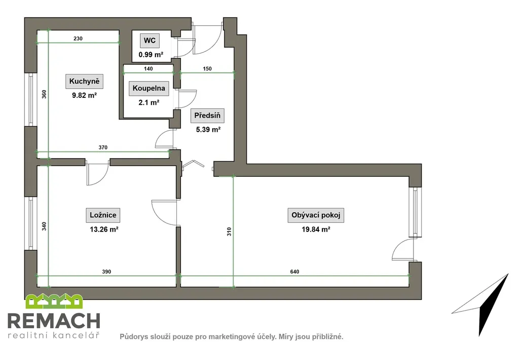 Byt o dispozici 2+1 nabízí dva neprůchozí pokoje a kuchyni s linkou. V zádveří je chodba se šatní skříní. Koupelna je vybavena vanou, umyvadlem a pračkou. Prostorný obývací pokoj má rozlohu 20 m2 a nabídne vstup na balkon. Ložnice má rozlohu 13,26 m2, kuchyně s linkou 9,82 m2. Byt nebude vybaven lednicí a sedací soupravou.