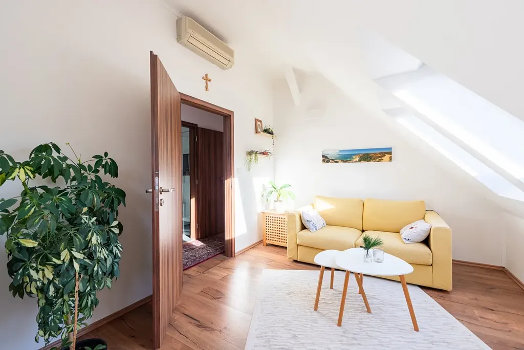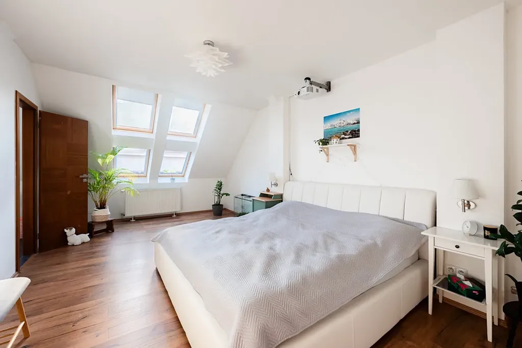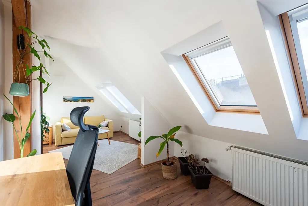 V nejvyšším patře domu budete bydlet v naprostém klidu, s krásným výhledem a příjemnou atmosférou, kterou dotvářejí velká dřevěná střešní okna i klimatizace zajišťující komfort v každém ročním období. Teplo i teplou vodu zajišťuje vlastní plynový kotel. Důležitou informací pro bydlení v posledním patře je také to, že střecha prošla v roce 2022 kompletní rekonstrukcí.