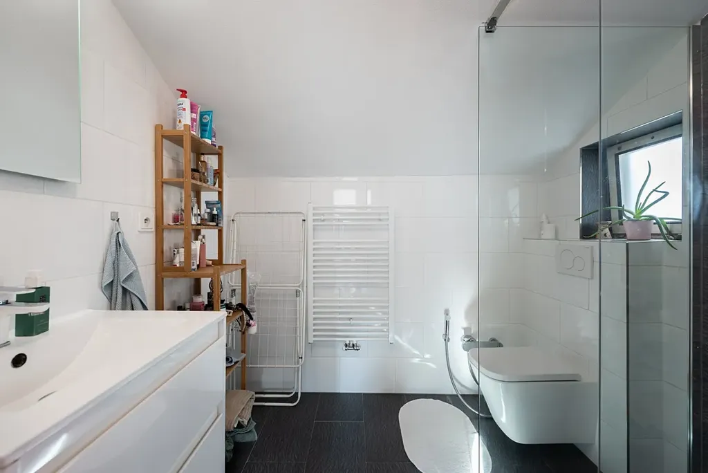 V horním patře se nachází obývací pokoj (22 m²), který díky svému členění může mj. částečně fungovat i jako domácí kancelář. Dále se v patře nachází moderní kuchyň s jídelním prostorem a přímým vstupem na terasu. Ta má příjemnou velikost, dostatek soukromí a krásný výhled. K dispozici je také zajímavě řešená menší ložnice/dětský pokoj (14m²). I zde v patře najdete plnohodnotnou koupelnu se sprchovým koutem a toaletou. K bytu náleží také sklep o velikosti 5 m².