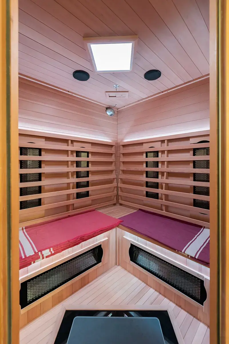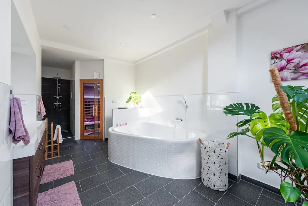 Na spodní úrovni se nachází velká vstupní hala, hlavní ložnice (22 m²) a opravdu výjimečná koupelna (21m2) s vanou pro dva, prostorným sprchovým koutem, dvojitým umyvadlem a vlastní infrasaunou. Příjemný dojem umocňují velká střešní okna, která poskytují dostatek denního světla. Na tomto podlaží je také velká vestavná skříň ve vstupní chodbě (23m2) a samostatná toaleta s plynovým kotlem.