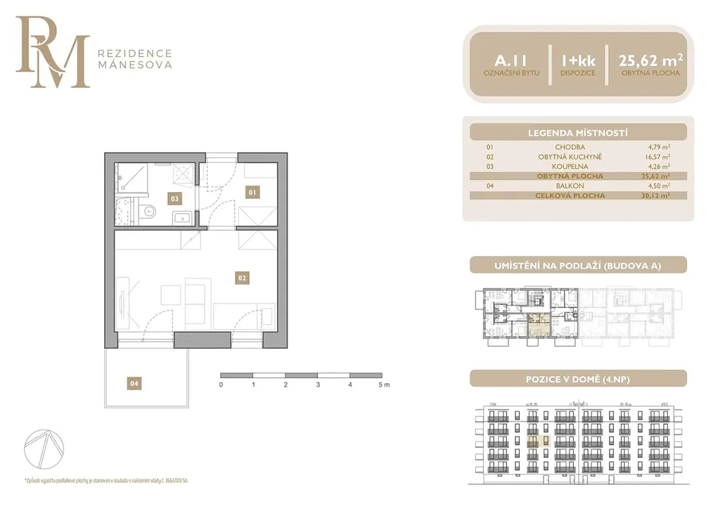Moderní byt 1+kk s balkonem v projektu Rezidence Mánesova v Lipníku nad Bečvou nabízí praktické a útulné bydlení v klidné lokalitě s výbornou dostupností centra města. Byt je vybaven vinylovými podlahami, teplovodním podlahovým topením a kuchyňskou linkou v ceně bytu. Samozřejmostí je příprava pro venkovní žaluzie a u bytů ve 4.–6. NP také příprava na klimatizaci. Interiérové prvky je možné zvolit ve světlé (2NP, 4NP, 6NP) nebo tmavé variantě (3NP, 5NP).