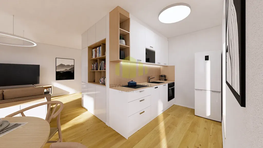 Světlý a moderně řešený byt 2+kk s balkonem v projektu Rezidence Mánesova v Lipníku nad Bečvou představuje ideální volbu pro páry, mladé rodiny nebo investory. Byt je vybaven vinylovými podlahami, teplovodním podlahovým vytápěním, kuchyňskou linkou v ceně bytu, přípravou pro venkovní žaluzie a u bytů ve 4.–6. NP také přípravou na klimatizaci. Interiérové prvky je možné zvolit ve světlé (2NP, 4NP, 6NP) nebo tmavé variantě (3NP, 5NP).