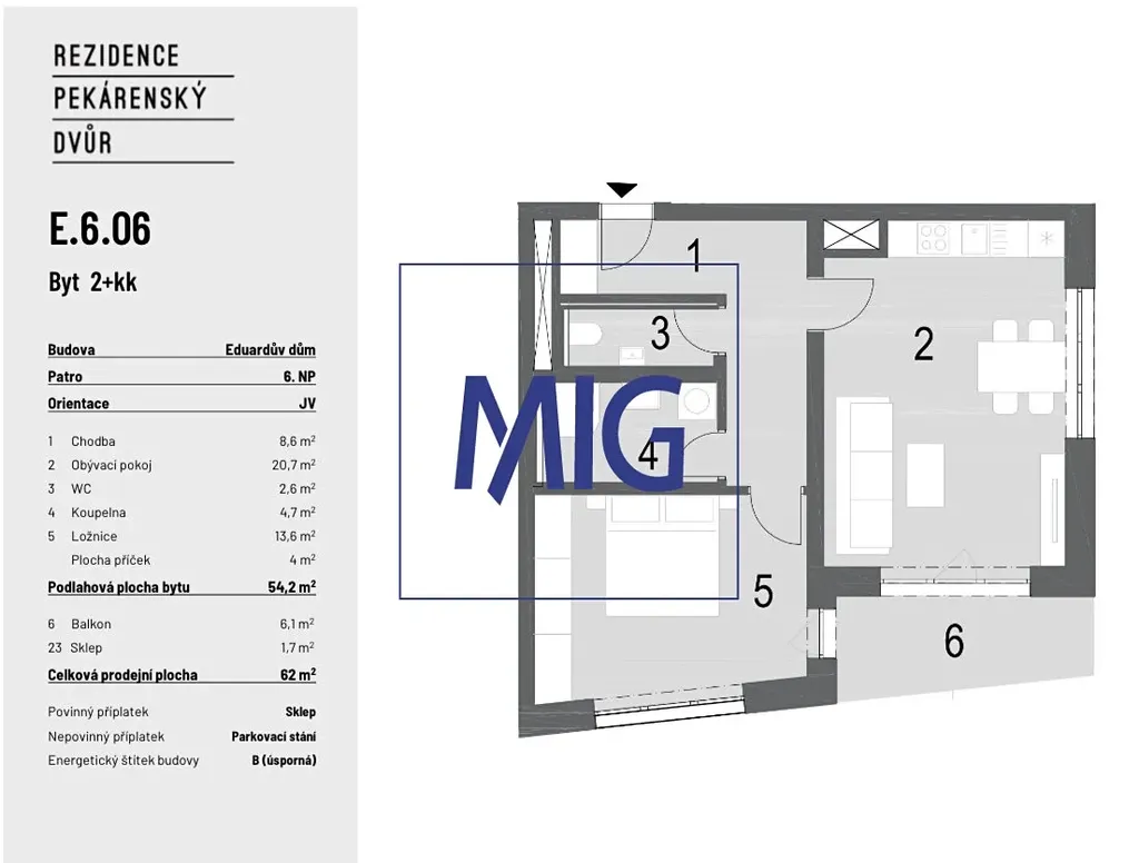 Nabízíme k pronájmu nový, moderní byt 2+kk (54,2 m²) s balkonem (6,1 m²) v oblíbeném rezidenčním projektu Pekárenský dvůr v Brně.