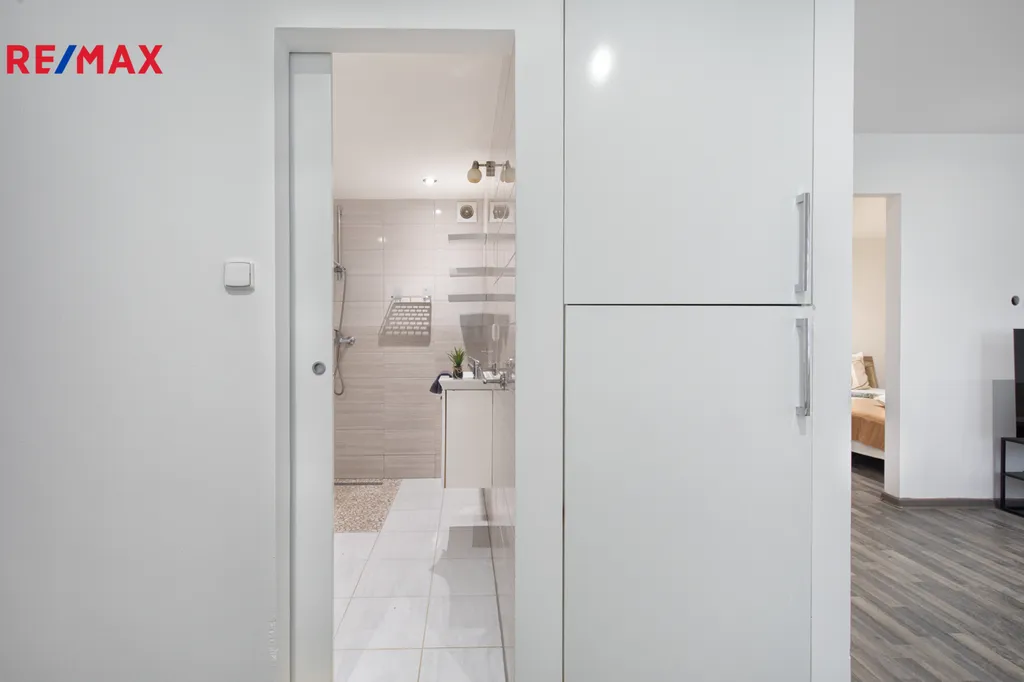 Vstupní chodba bytu je vybavena důmyslně řešenou skříní, která poskytuje dostatek úložného prostoru a zároveň nabízí místo pro pračku v její spodní části. Z chodby plynule projdete do prostorného obývacího pokoje, jehož součástí je kuchyňský kout. Orientace oken je na jih, což zajišťuje příjemné světlo po celý den. Na obývací pokoj navazuje atypická ložnice se zabudovanou šatní skříní, kde máte dostatek soukromí.