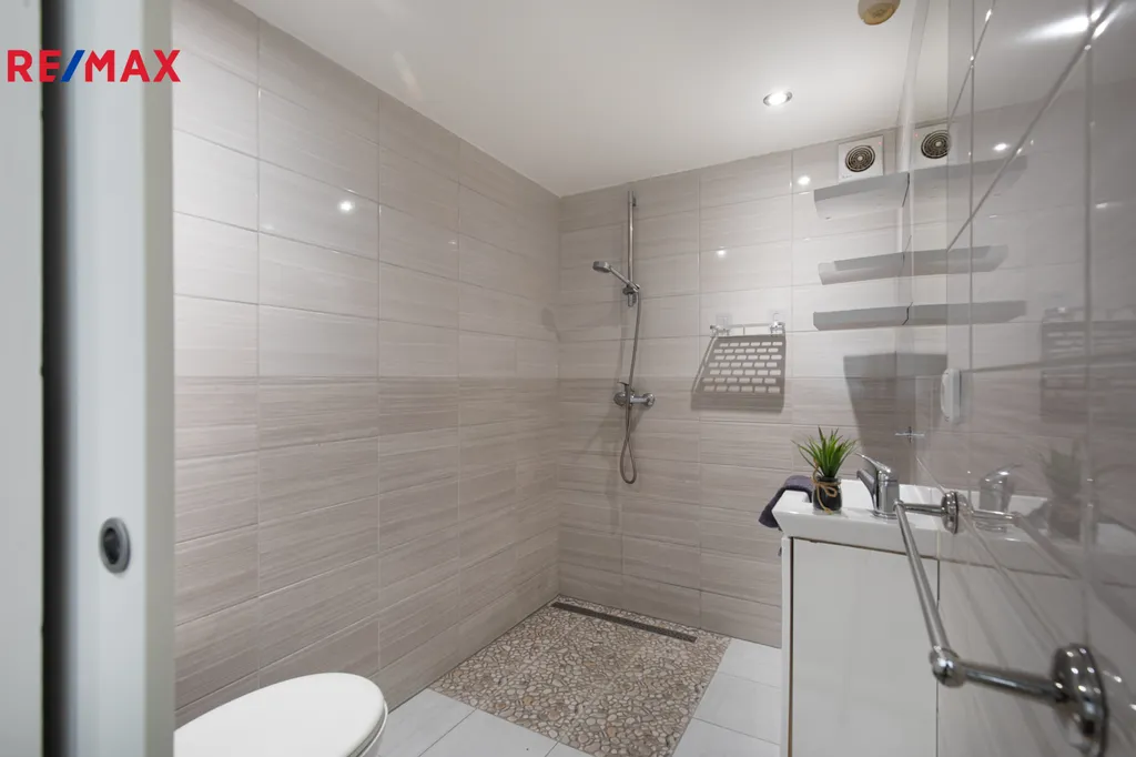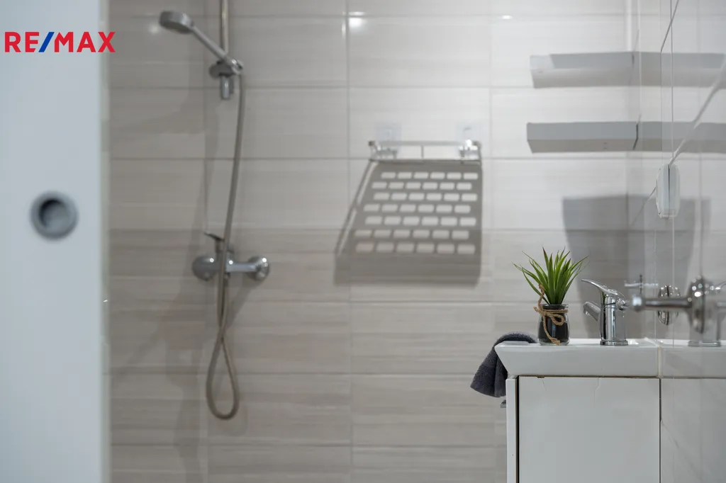Koupelna je vybavena sprchovým koutem bez uzavření – praktické a snadno udržovatelné řešení.