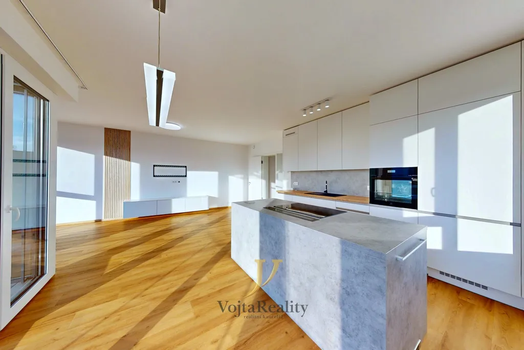 Ve výhradním zastoupení nabízíme k pronájmu nadstandardní byt 4+kk o užitné ploše 114 m², umístěný v posledním třetím podlaží moderní rezidenční výstavby Vila Park na ulici Milana Ticháka. Součástí bytu jsou dvě terasy o celkové ploše 18 m², dva sklepy o velikosti 9,5 m² a 8,8 m² a dvě garážová parkovací stání s přípravou pro instalaci rychlonabíjecí stanice.