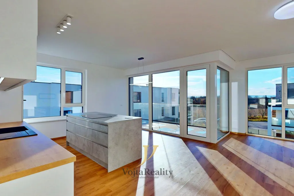 Dispozice bytu je navržena s důrazem na komfort, funkčnost a dostatek úložného prostoru. Vstupní chodba je vybavena vestavěným nábytkem s nočním osvětlením. Obývací pokoj je propojen s moderní kuchyní, která nabízí kuchyňský ostrůvek s indukční varnou deskou a výsuvnou digestoří, nadstandardně velkou lednicí s mrazákem a kompletní sadu spotřebičů.