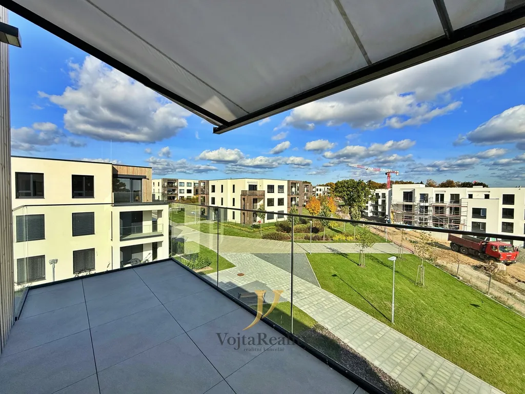 Dispozice bytu je navržena s důrazem na komfort, funkčnost a dostatek úložného prostoru. Vstupní chodba je vybavena vestavěným nábytkem s nočním osvětlením. Obývací pokoj je propojen s moderní kuchyní plně vybavenou spotřebiči Electrolux. Ložnice nabízí praktickou šatnu, pracovní kout a přímý vstup na vlastní terasu. Další pokoj lze využít jako dětský pokoj, pracovnu nebo pokoj pro hosty. Koupelna je vybavena vanou se sprchovou zástěnou, umyvadlem a úložnými prostory, toaleta je oddělená. Nechybí ani technická místnost s přípravou na pračku a sušičku.