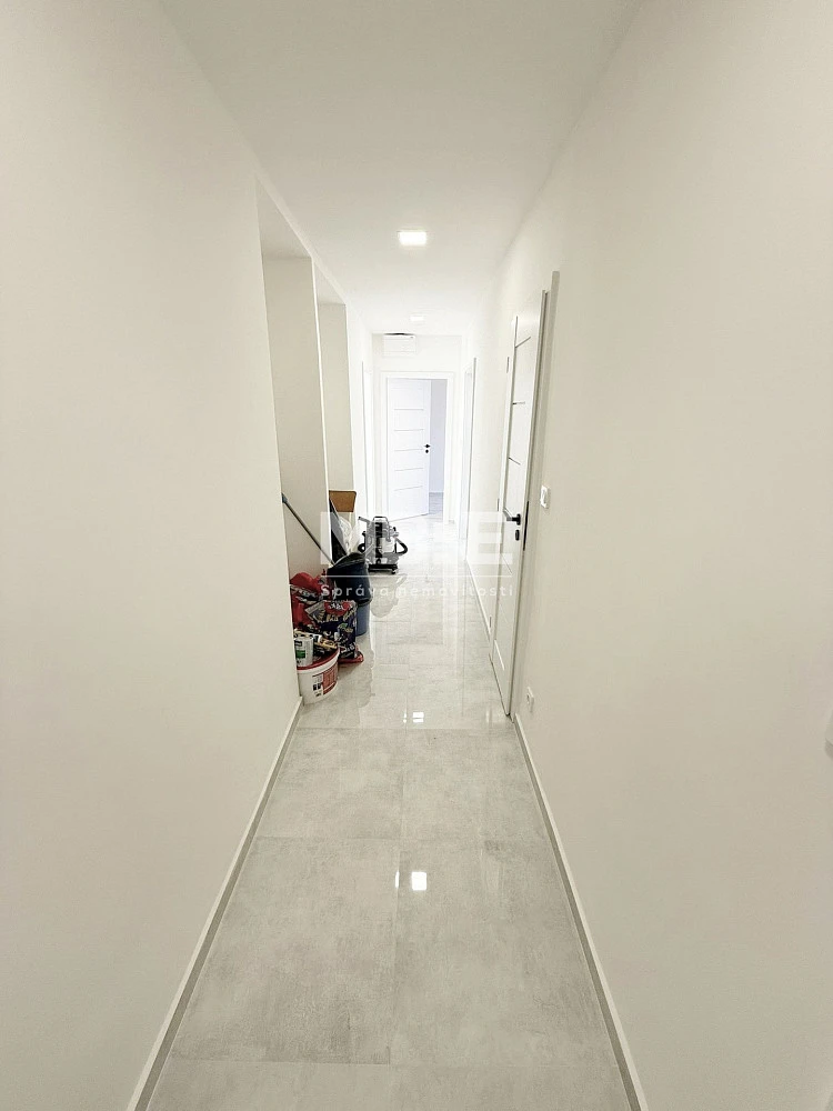 Byt působí velmi čistým, moderním a příjemným dojmem. Dominantou je stylová kuchyňská linka na míru vybavená vestavnými spotřebiči včetně elektrické a mikrovlnné trouby, myčky nádobí, chladničky s mrazákem, indukční desky a digestoře s elegantním LED podsvícením. Koupelna nabízí vanu a WC je samostatné. V celém bytě jsou položeny kvalitní plovoucí podlahy a dlažba, doplněné moderními dveřmi a osvětlením, díky čemuž interiér působí opravdu velmi útulně a nadčasově.