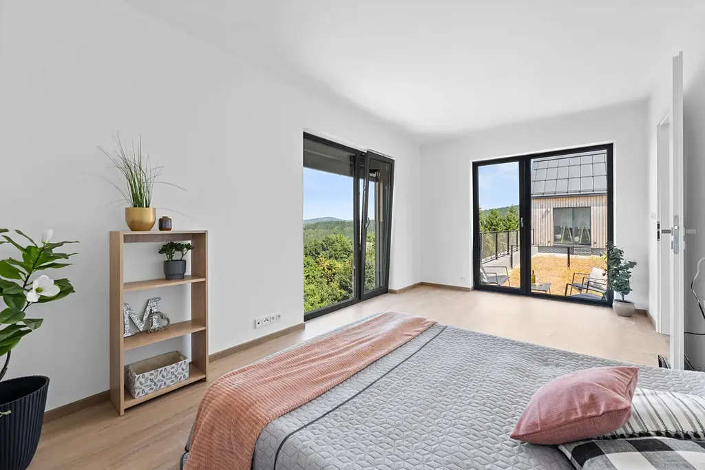 Nabízíme k prodeji exkluzivní moderní chalupu o dispozici 3+kk a celkové výměře 89,1 m² dle NOZ (čistá užitná plocha 85,9 m²). Dům je orientován na všechny světové strany, díky čemuž nabízí úchvatné panoramatické výhledy na Jizerské hory a okolní krajinu.