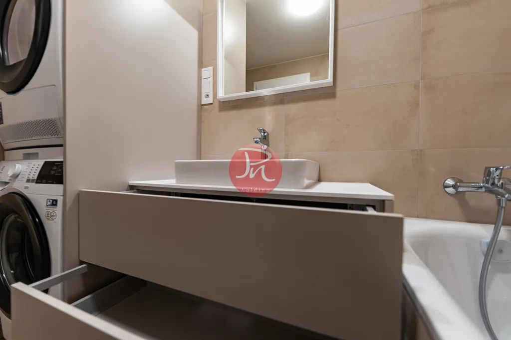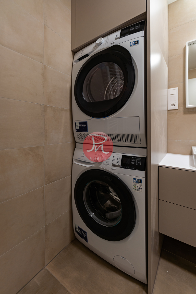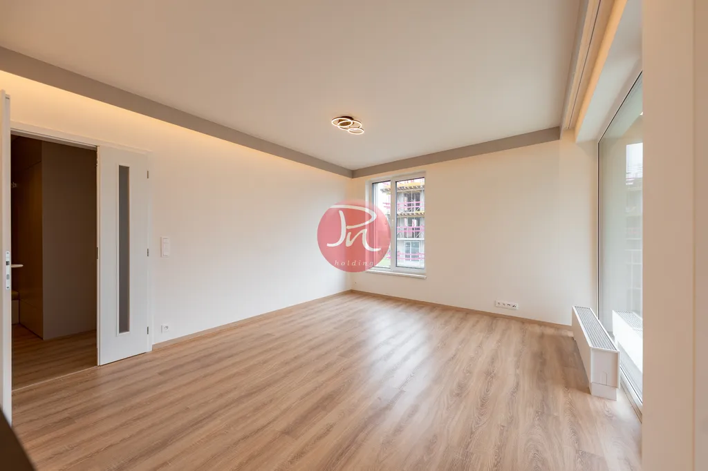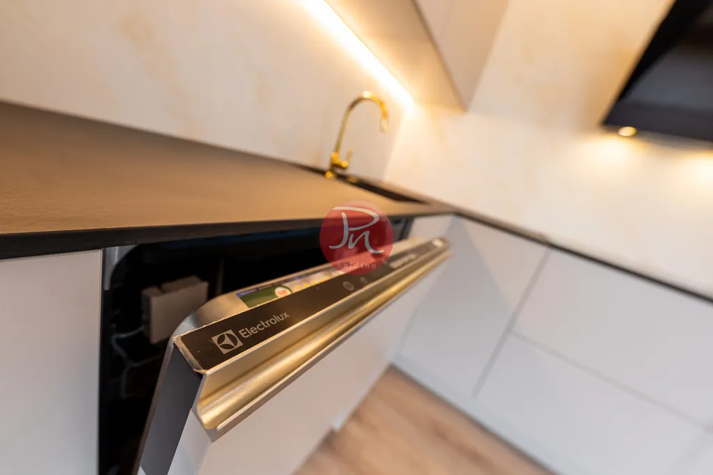 Byt se vyznačuje moderním designem a vysokou kvalitou použitých materiálů, které splňují nároky i těch nejnáročnějších klientů. Interiér je promyšleně rozvržen tak, aby poskytoval maximální komfort a zároveň důvody k relaxaci. Prostorný obývací pokoj s velkými okny nabízí nádherný výhled na městskou panorama a přirozené osvětlení, které vytváří příjemnou atmosféru po celý den.
