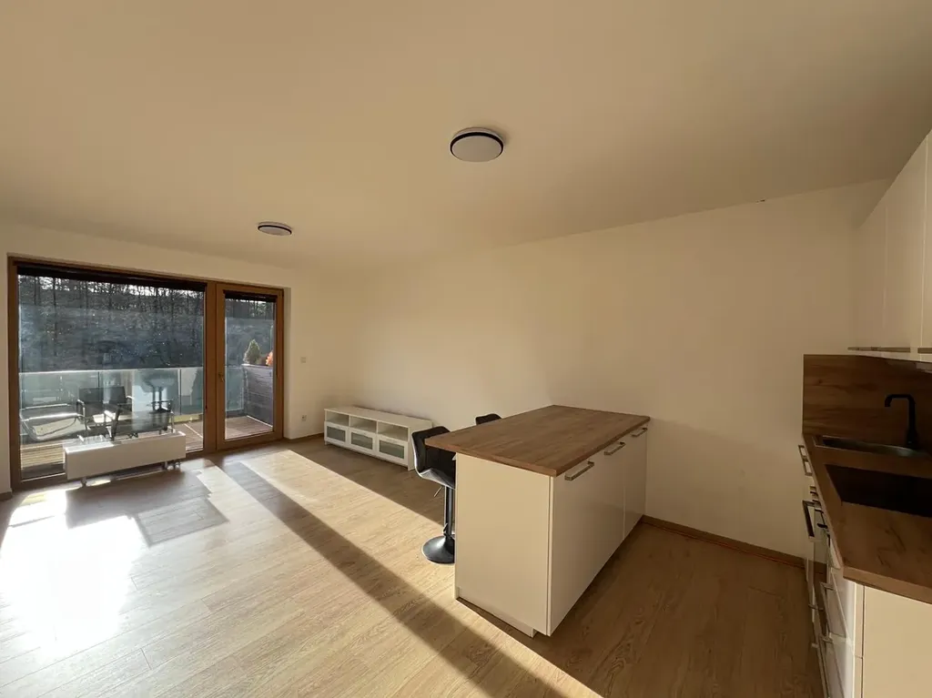 Byt disponuje světlým obývacím pokojem s plně vybavenou kuchyňskou linkou, jejíž součástí jsou všechny potřebné spotřebiče. Velkou výhodou je kuchyňský ostrůvek doplněný o barové židle, který slouží jako jídelní i pracovní prostor. Ve vstupní chodbě je praktická vestavná skříň na míru, poskytující dostatek úložného prostoru. Koupelna je vybavena vanou, toaletou a nachází se zde také pračka, která zůstává nájemci k dispozici. Největším benefitem je prostorný balkon s krásným výhledem do přilehlého parku, ideální pro relaxaci u kávy nebo večerní posezení.